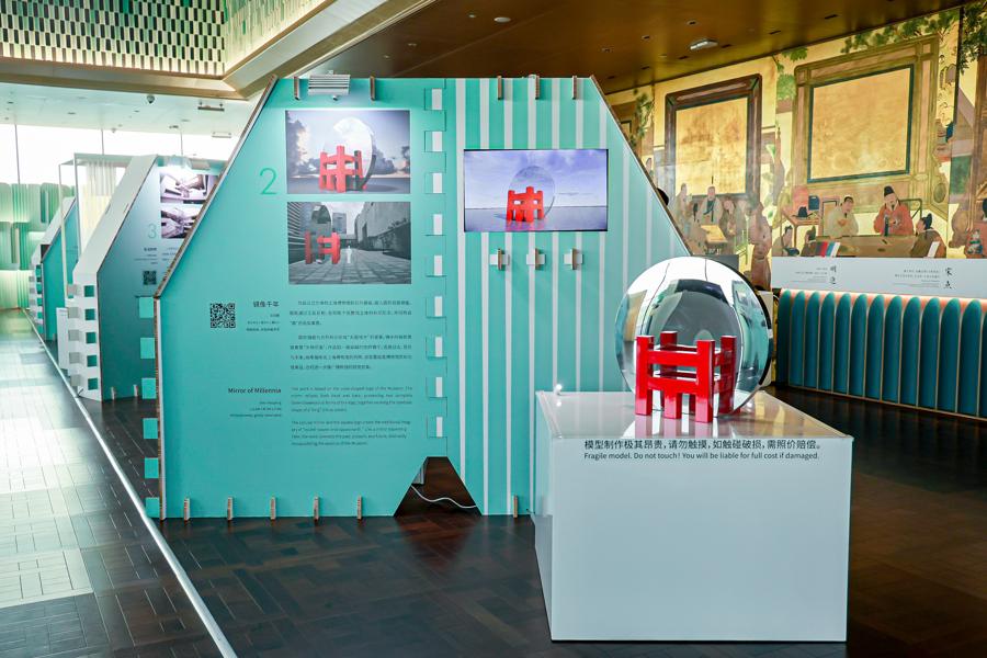 《鏡像千年》以立方體的上博標識爲基礎,在其中嵌入圓形雙面鏡面,形成“天圓地方”的意象,如一面穿越時空的“鼎”。