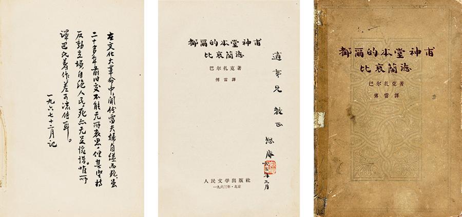此後二人的交往便急遽減少了。1966年9月3日,傅雷夫婦自縊身亡。10月4日,樓適夷從女兒樓遂那裏得知消息。在日記中,他留下了這樣的話:“像傅雷這種人必然只有這條路,可謂得其所哉了。”1967年下半年,不知是否因爲想到了故人,樓適夷集中閱讀了一批傅雷譯巴爾扎克小說。12月,他在傅雷1963年3月籤贈他的《都爾的本堂神甫 比哀蘭德》空白頁上寫下這樣一段話:“在文化大革命中,聞傅雷夫婦自縊而死,雖二十多年前舊交不能無所哀思,但其堅持反動立場,自絕人民,死亦無足惋惜。唯所譯巴氏著作差可流傳耳。”這段話與日記中的話,都不像是在壓力下所寫,所以應該都是真心話吧。