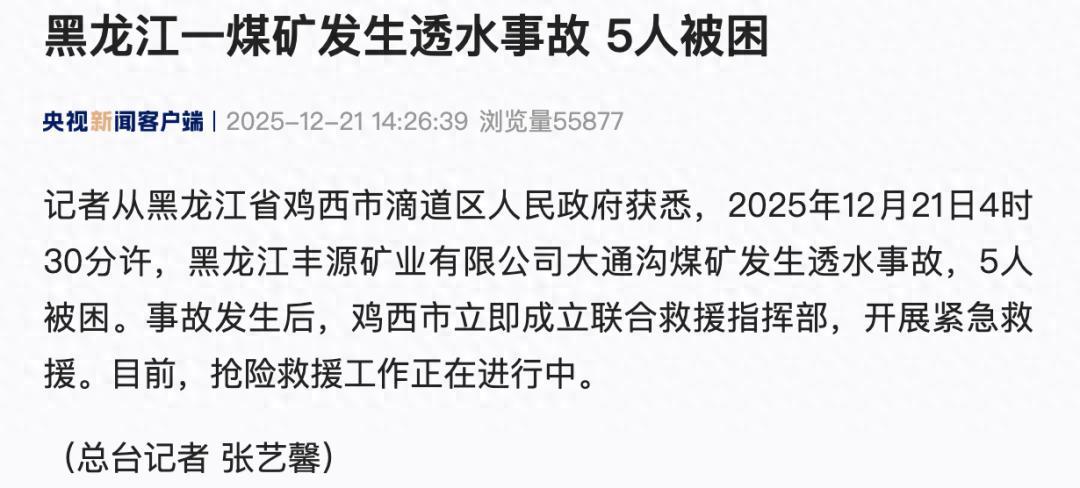 突發!黑龍江一煤礦發生透水事故,5人被困