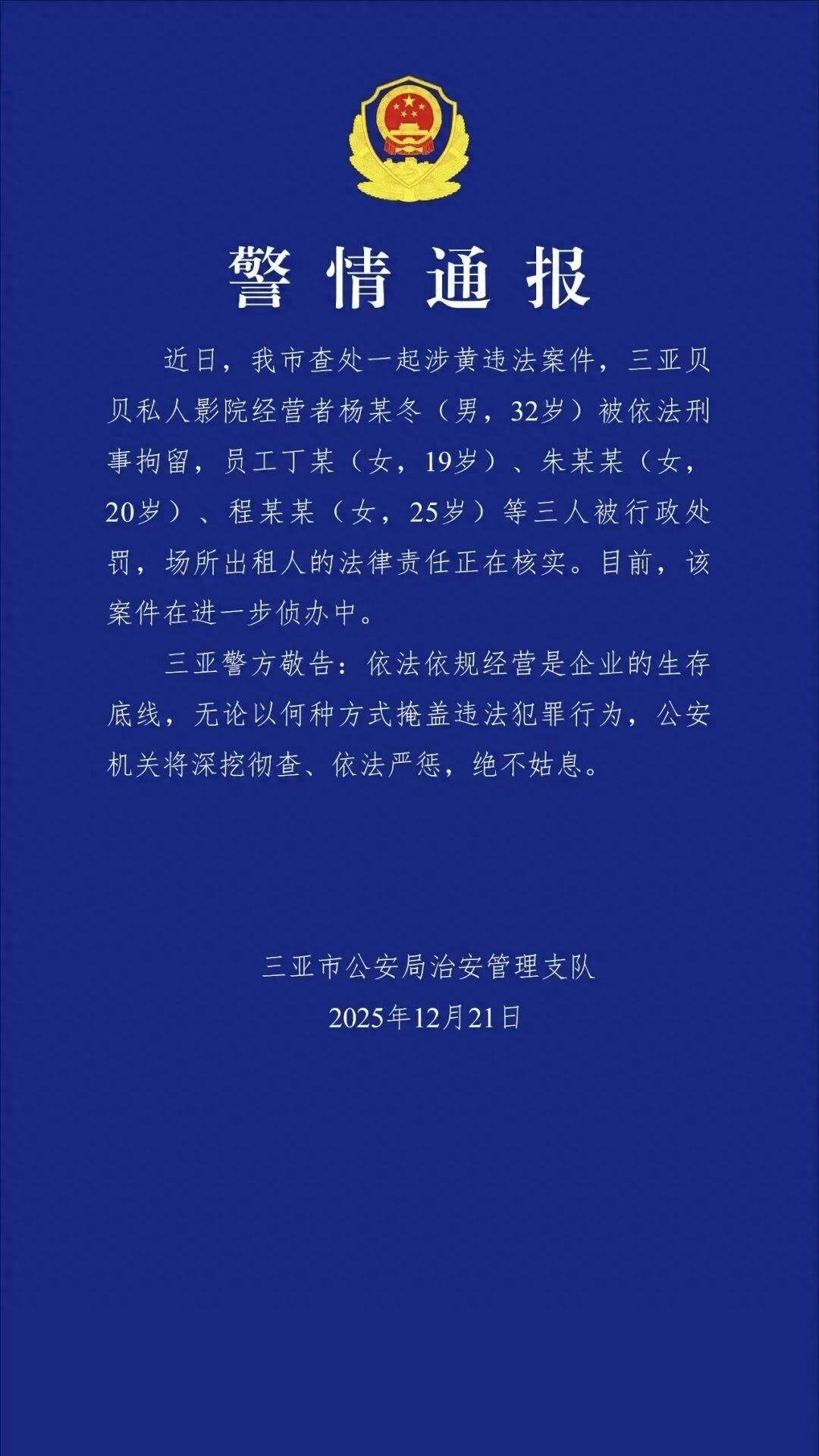 12月21日,三亞警方發佈警情通報,一私人影院經營者楊某冬(男,32歲)被刑拘,另有3名女員工被行政處罰。
