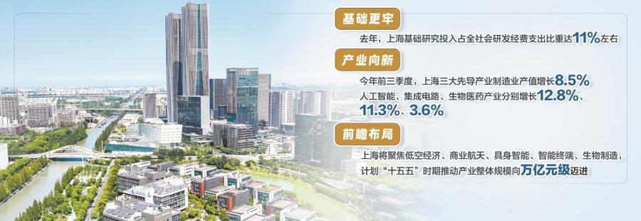新質生產力正成爲上海高質量發展的核心驅動力。今年前三季度,上海三大先導產業增長8.5%,其中人工智能、集成電路、生物醫藥產業分別增長12.8%、11.3%、3.6%,三大先導製造業產值佔全市工業比重達12.3%,較2024年提高0.6個百分點。