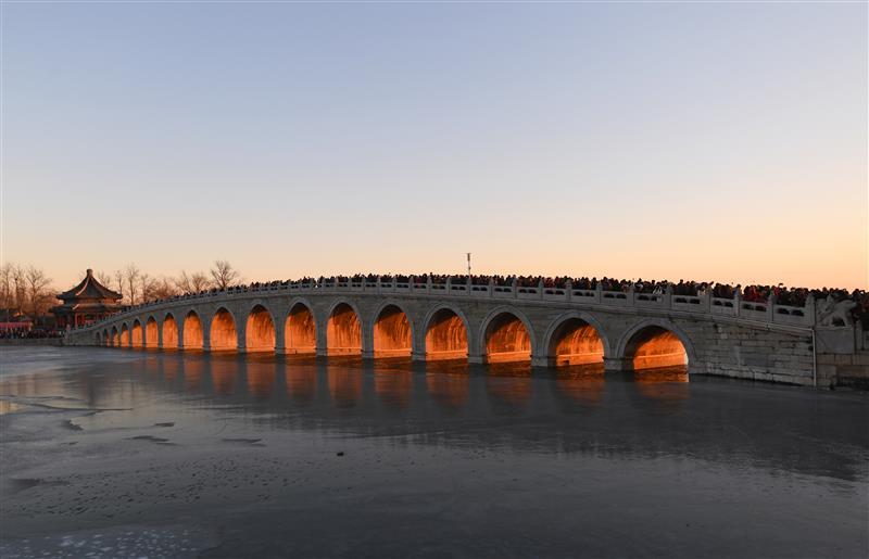 這是12月21日拍攝的頤和園十七孔橋“金光穿洞”美景。新華社記者 陳曄華 攝
