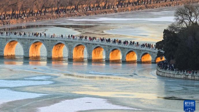 那麼,“金光穿洞”是如何形成的?爲什麼只在冬至前後出現?陽光又是怎樣精準穿過橋洞的呢?工作人員介紹,“金光穿洞”的形成,是太陽高度角、太陽方位角和橋身走向共同作用的結果。頤和園十七孔橋略偏西北、東南走向,冬至前後,太陽直射點在南迴歸線附近,落日方向偏西南,恰好能灑滿橋洞的東側內壁。隨着日落推進,太陽高度角越來越低,陽光照射方向幾乎與湖面平行,並在湖面灑下長長的光影,便形成了“金光穿洞”的景觀。