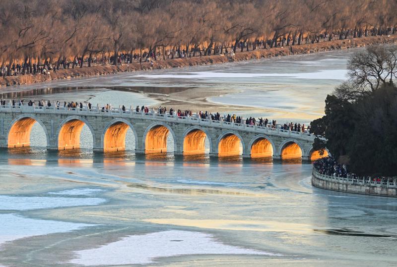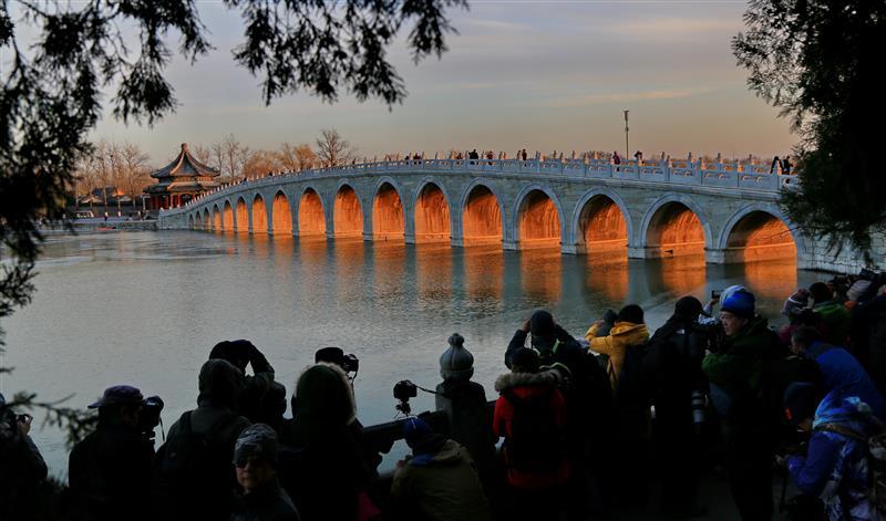 當日,北京頤和園十七孔橋出現“金光穿洞”美景,吸引許多遊客和攝影愛好者前來觀賞拍攝。新華社記者陳曄華攝