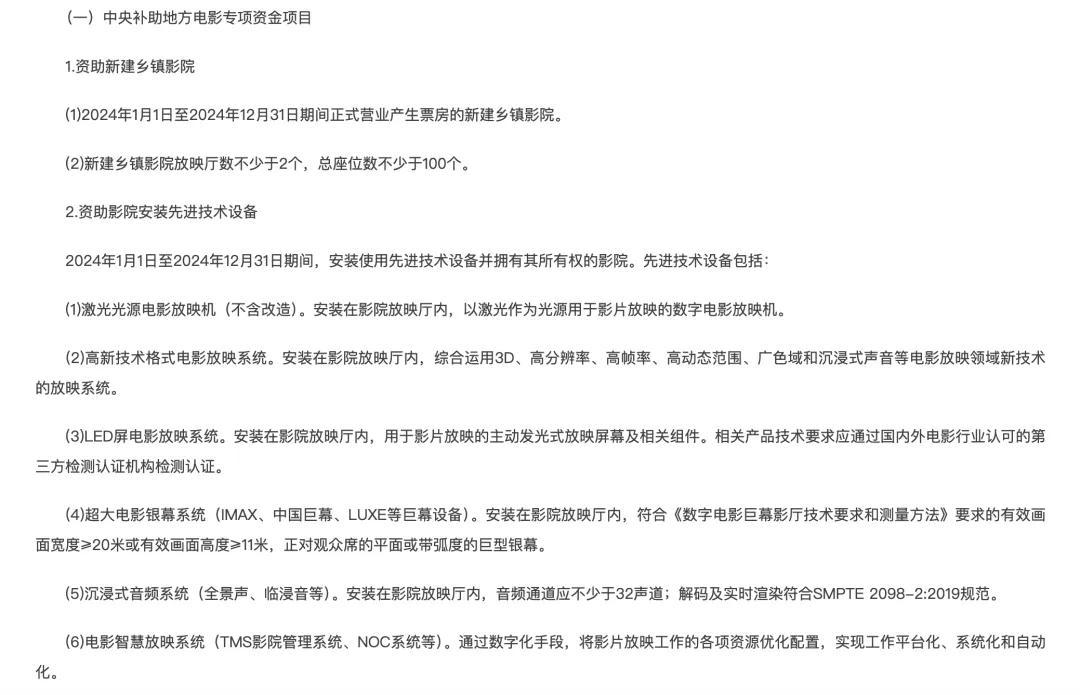 2025年北京市電影局在專項基金的申報通知,關於銀幕數量,僅保留“鼓勵鄉鎮新建新影廳”一項,大量補助細節集中在“資助影院安裝先進技術設備”上,涵蓋激光放映機、LED 屏、巨幕系統等六大類設備。