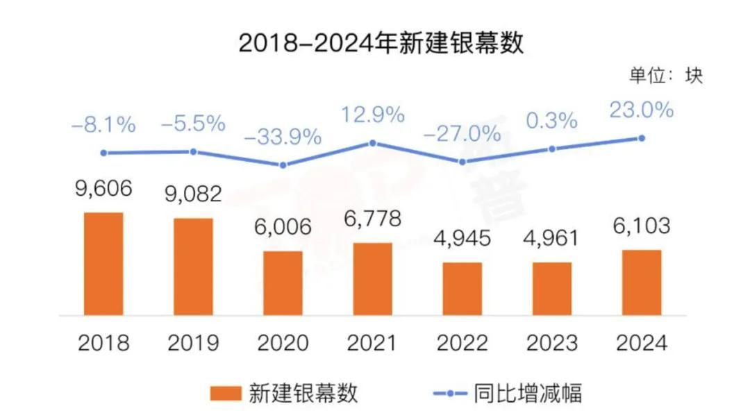 2021年,《“十四五”中國電影發展規劃》中寫道,期望在2025年,銀幕數將超10萬。但市場卻早已放下了對銀幕數量的執念,2024年全年新增銀幕6103塊,爲2019年的67%。
