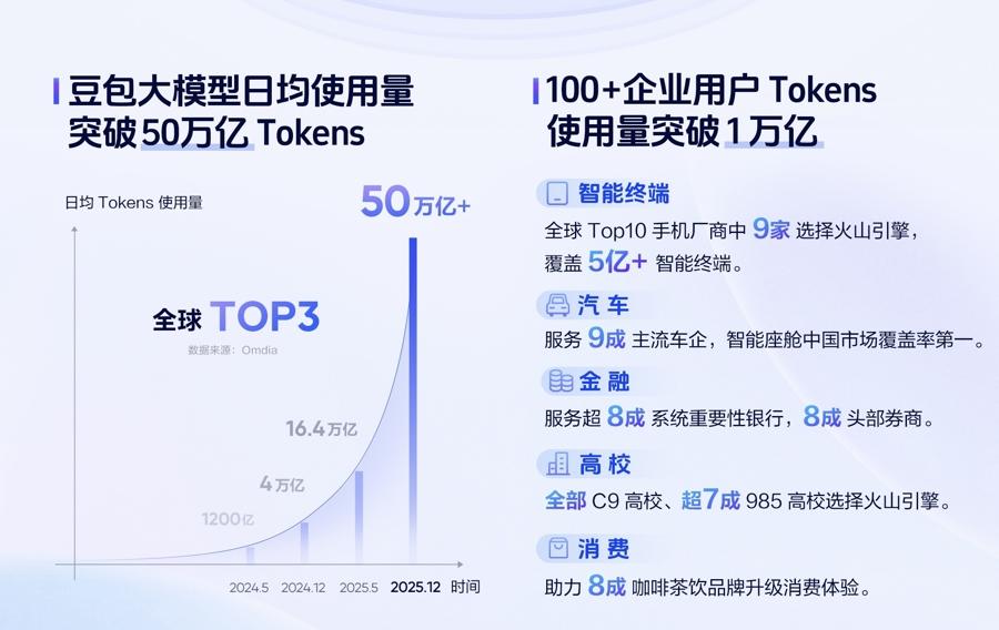 衡量AI發展速度的核心指標是什麼?在火山引擎總裁譚待看來,答案很簡單——Tokens調用量。“模型只有被調用才能發揮價值;而越有價值的模型,調用量就會越多。”他說,截至今年12月,豆包大模型日均調用量已突破50萬億Tokens,自發布至今實現了417倍的爆炸式增長,相比去年同期也增長了超過10倍。