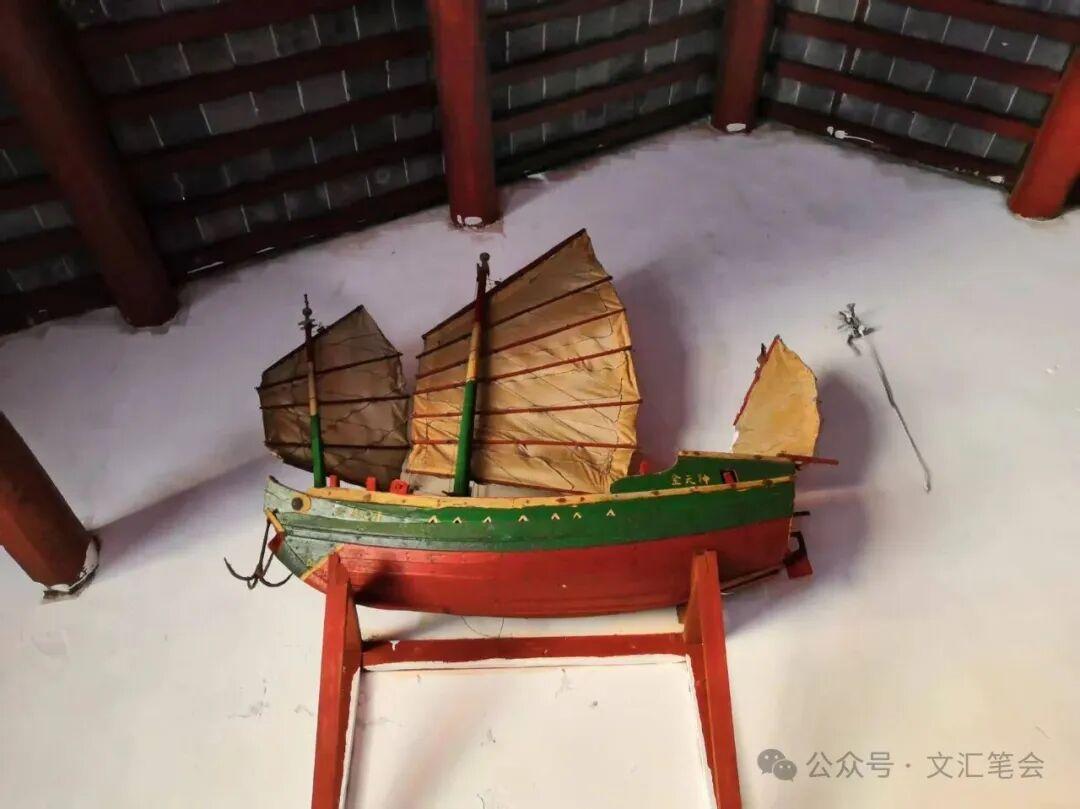 早年的娘船多是舊式帆船,如今帆船時代已經遠去,娘船裏的機船越來越多。泗礁島黃沙岙的泗神殿內,東西兩牆各有一艘小船,所在之處甚高,已經快要接近大殿的房梁,這是兩艘小漲網船,是一種由柴油機驅動的近海捕魚船。此外,泗礁島高場村天后宮、枸杞島石浦村天后宮、嵊山島的張老相公廟等處也有小漲網船的身影,而形制略有不同,手藝人各自的審美情趣,致使船模形態各異,有的粗糙,木紋斷茬處有着撕裂般的痕跡,倒是別有一番野趣。有的精細,弧線流暢而又自然,定是費了不少打磨的心力。還有一些娘船年久破敗了,桅杆折斷,船板開裂,落滿灰塵。
