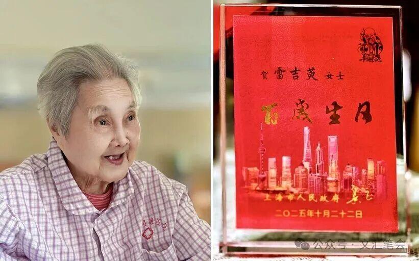 1925年10月出生的母親,前幾日,得到上海市政府及市長髮來的祝賀及證章,一塊透明的沉甸甸的水晶座,做成一本書大,上面有字:“賀雷吉萸女士,百歲生日。”