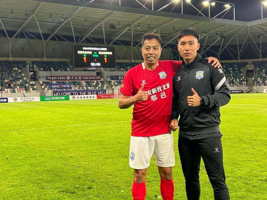 37歲的張寒冰(左)在對陣日照一戰中打入職業生涯首球,他激動得徹夜未眠(受訪者供圖)