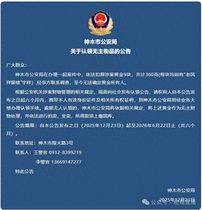 根據公安機關涉案財物管理的相關規定,現面向社會發布認領公告,請權利人自本公告發布之日起六個月內,攜帶本人有效身份證件及相關所有權證明,到神木市公安局刑偵業務大樓辦理認領手續。逾期無人認領的,神木市公安局將依據相關規定,將上述黃金作爲無主財物處理,並依法進行拍賣、變賣,所得款項上繳國庫。