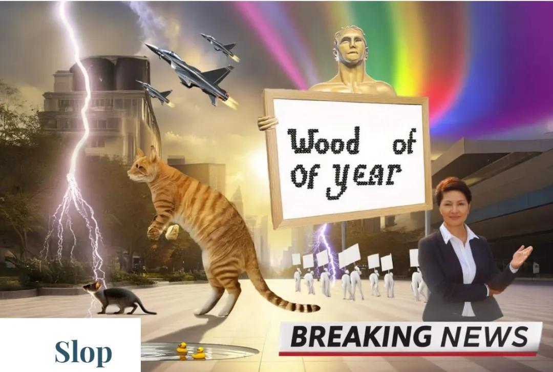 另外一個後果,就是垃圾的批量化生產。韋氏詞典和《經濟學人》選出的2025年度關鍵詞是“slop”。“slop”並非新造詞,其歷史可追溯至15世紀,原意爲稀爛食物或泔水。而今,它成了AI生成內容的代名詞:海量、平庸、毫無個性,正在堵塞互聯網。