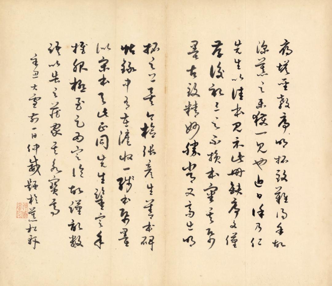《雁塔聖教序》明拓致難得,餘故深慕之,未獲一見也。近日徐乃仁先生(晨齋)以佳本見示,此冊缺序文,僅存後記。三“之”不損本,審其紙墨,古致精妙,勝常又高出明拓之上矣。今檢張彥生《善本碑帖錄》中有“在滬收一殘本,紙墨似宋本”,與此正同。先生鑑定,餘推服極至,足爲定論。故謹記數語,以告之藏家,其永寶焉。辛丑大雪前一日,仲威題於慕松軒。