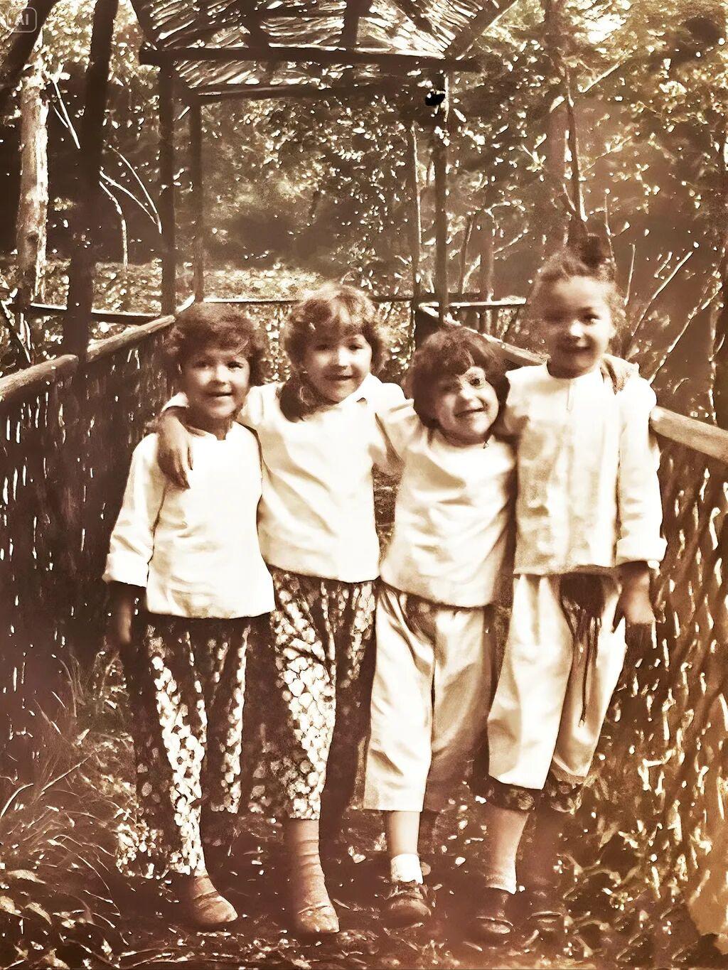 一張舊照,在遙遠的草堂園,母親(下圖右二)和她的幾個表姐妹們白衣花褲,歡樂地“勾肩搭背”,被樹花葉簇擁,笑臉笑聲要衝出畫面了。