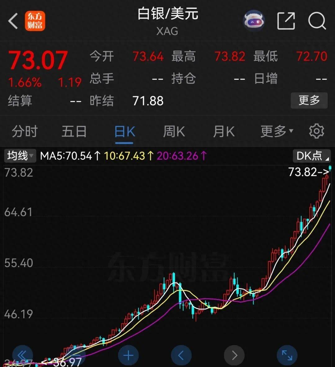 12月26日,現貨白銀跳空高開。截至07:08,現貨白銀漲幅擴大至2%,報73.422美元/盎司,再創歷史新高。