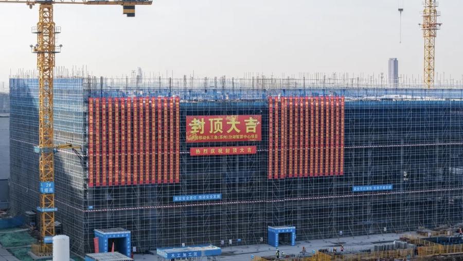 近日,中國移動長三角(蘇州)汾湖智算中心項目一階段5號機房樓主體結構順利封頂,標誌着項目建設取得了關鍵突破。