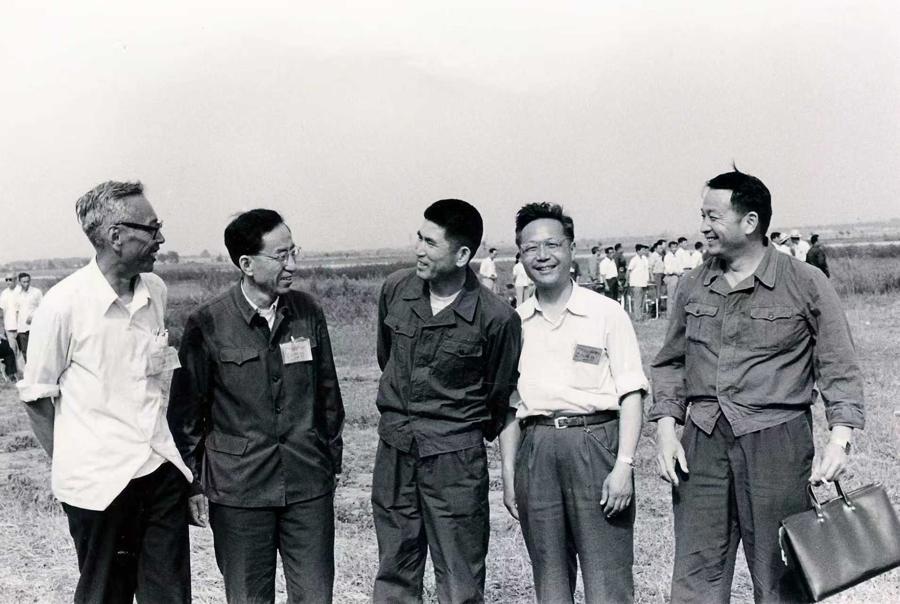 顧誦芬(右二)與試飛員曲學仁(中)、試飛指揮員王昂(右一)、現場總指揮管德(左一)等在殲-8Ⅱ試飛現場