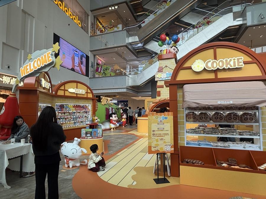 蠟筆小新與PEKO&POKO,這兩個深植人心的經典IP形象,在上海的商場裏迎來了他們的第一次合作。雙方以烘焙爲線索,共同打造出一間幻想般的“嘟甜點心屋”。記者在一樓中庭看到,“嘟甜點心屋”以烘焙屋爲主線,打造出一個沉浸式的視覺空間:櫥窗陳列着可愛的棒棒糖與餅乾,牆面繪有小新與PEKO的忙碌身影,粉紅與暖黃的主調交織出夢幻的節日氛圍,彷彿空氣中都瀰漫着糖香。展區還設有多個互動裝置,包括“嘟嘟投投樂”“動感光波噴噴爐”“咔咔餅乾盒”等,消費者可在互動中體驗“笑的鬆弛感”與“甜的治癒力”。