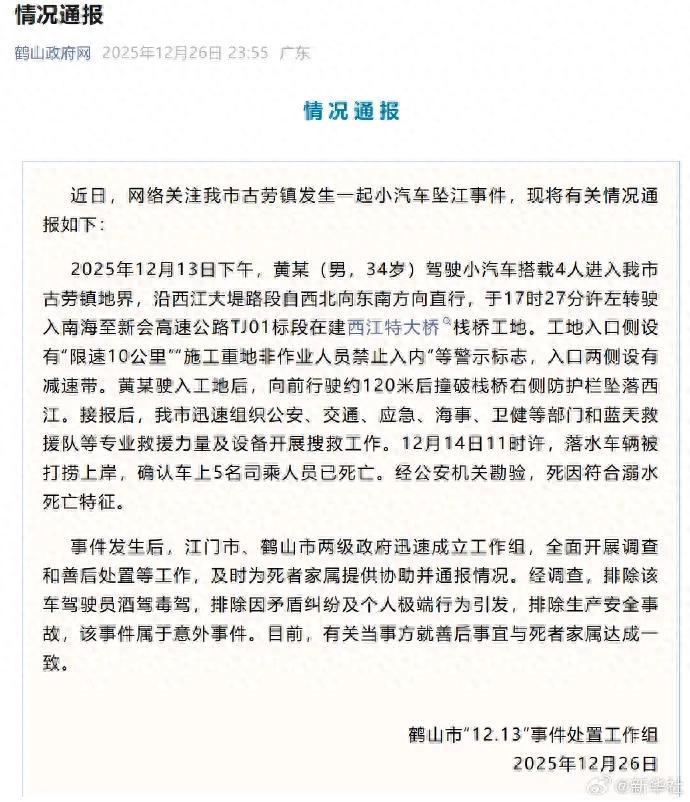 接報後,鶴山市迅速組織公安、交通、應急、海事、衛健等部門和藍天救援隊等專業救援力量及設備開展搜救工作。12月14日11時許,落水車輛被打撈上岸,確認車上5名司乘人員已死亡。經公安機關勘驗,死因符合溺水死亡特徵。
