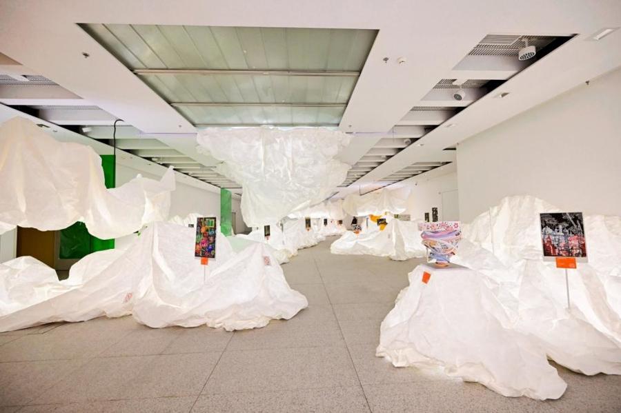 步入展廳,只見“虛山水”裝置將人們引領至一個夢幻空間。白色半透紙質材料貫穿展廳全場,通過裁剪、褶皺、堆疊、懸掛等方式塑形,讓人彷彿置身於穿越時空後的超現實虛構世界,以此呼應“打開時間之門”的展覽主題。這一特別的展陳設計由著名工業設計師楊明潔帶來,並且實現了突破性的綠色創新,開創性地全面採用100%可循環可再生材料,構建起一個真正意義上的“零廢棄”布展範式。