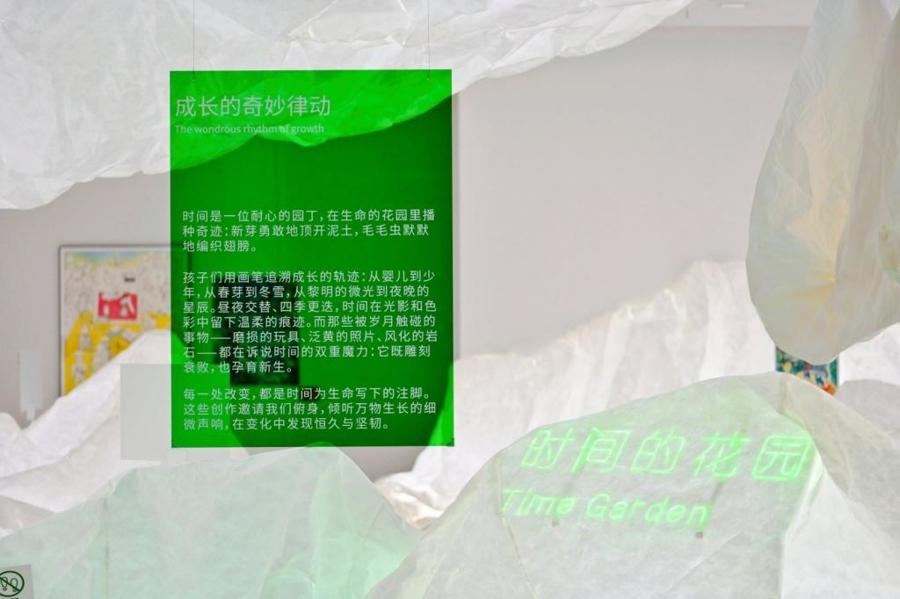 展廳中,“時間的花園”“時光魔法毯”“未來觀測站”“記憶收藏夾”四個充滿童話感的主題,精心呈現小藝術家們充滿童真的作品,邀請不同年齡段的觀衆們來到這裏,靜靜聆聽孩子們用創意訴說的時空故事。