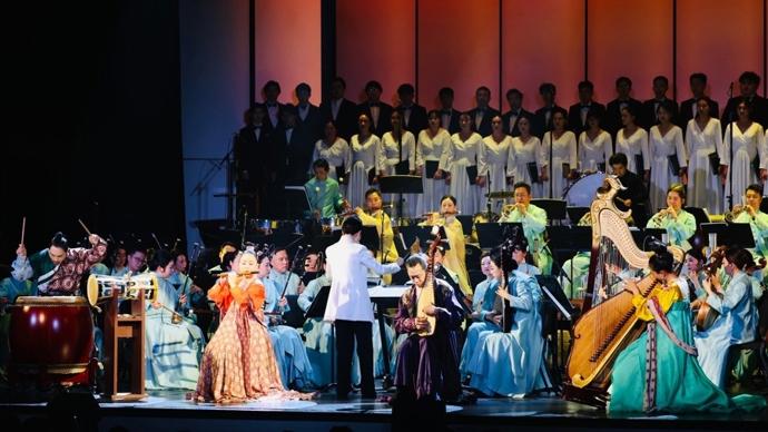 整部音樂會以《詩經》爲源頭,循着唐宋詩詞脈絡徐徐展開,通過《萬物生息》《江河滔滔》《朝日流霞》《空山月明》《風骨錚鳴》《星河共潮》六大篇章,勾勒出一部流動的華夏文明史詩。《萬物生息》以自然生靈與農耕意象爲底色,盡顯華夏文明初萌時的質樸生命力;《江河滔滔》象徵時光與歷史奔流不息,寄託行旅、送別與征途裏的浩蕩情懷;《朝日流霞》捕捉詩詞中絢麗明亮的瞬間,鋪展大唐豐沛氣象與人文光彩;《空山月明》轉入靜謐深遠意境,詮釋東方哲學中天人合一、物我兩忘的審美境界;《風骨錚鳴》以剛健器樂語言,傳遞士人的精神氣節與擔當胸懷;《星河共潮》收束於開闊交融視野,寓意古典精神與當代心靈的同頻共振。而該篇章歌詞由復旦大學中文系教授駱玉明教授以集句手法創作,這一古典文學手法讓傳統詩詞擁有全新時代語境,從“天道自強”的古老哲思到“萬紫千紅總是春”的時代展望,不同時代的詩詞意象在此互文共生,編織出一幅由古及今的人文圖景,清晰勾勒出中國文化從深厚歷史邁向廣闊未來的發展軌跡。