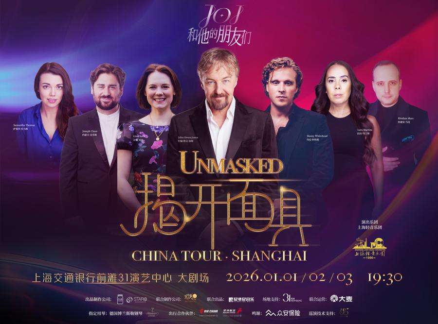 現在,上海觀衆可以在2026年新年的第一天,現場欣賞到JOJ和他的多位摯友們的表演,近距離感受倫敦西區頂級藝術水準的視聽盛宴。《Unmasked 揭開面具——JOJ和他的朋友們》音樂會中國巡演日前在洛克外灘衆安大樓露臺舉辦發佈會。約翰·歐文-瓊斯與本次音樂會音樂總監約翰·奎克共同亮相外灘,爲即將於2026年1月1日— 3日在交通銀行前灘31演藝中心·大劇場舉行的巡演全國首演揭曉閃亮時刻。