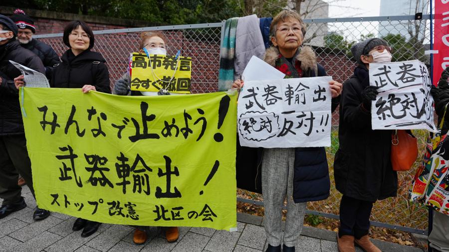12月25日,民衆在日本東京的自民黨總部大樓前參加抗議活動。 針對日本執政聯盟自民黨與日本維新會擬取消對武器出口的5種類型限制、爲武器出口大幅“鬆綁”,日本民衆25日下午在位於東京的自民黨總部前舉行抗議集會。 新華社發