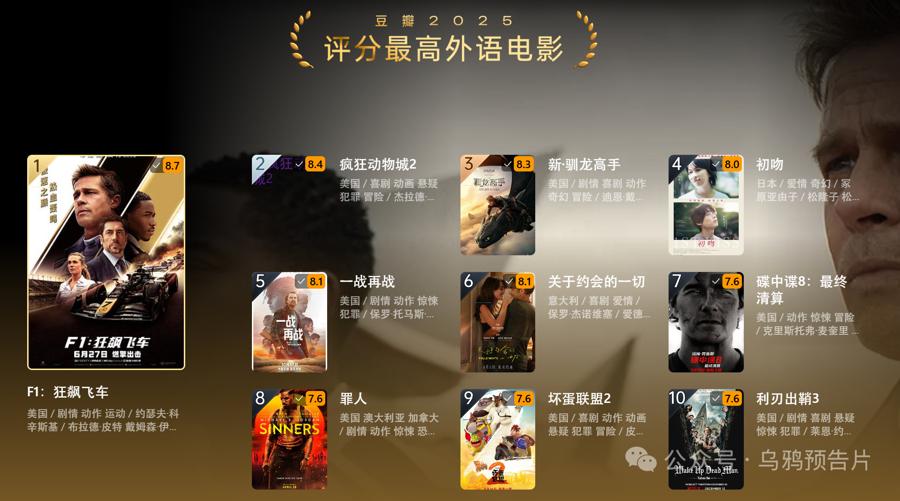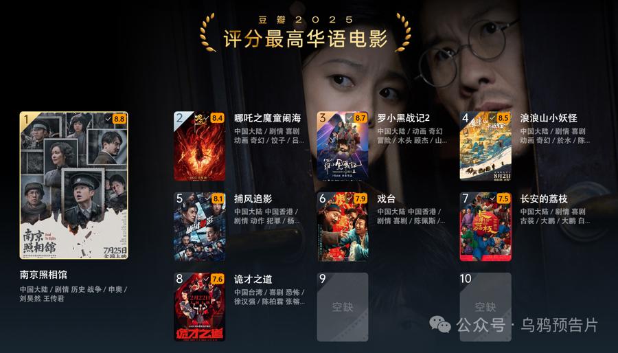 ▷2025豆瓣電影年度榜單發佈。其中,相比往年的10部作品,本次入圍的華語電影只有8部,《南京照相館》評分最高;外語電影方面,《F1:狂飆飛車》評分最高。