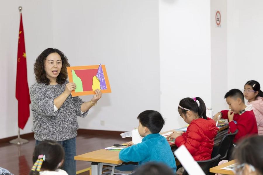 “山水畫裏的上海”少兒藝術工作坊則以上海博物館館藏元代繪畫作品《澱湖送別圖》爲靈感,融入當代創意——利用“三遠法”分解空間層次,將皴法轉換爲裝飾語言,製作山水拼貼畫。在創作過程中,孩子們邊欣賞古代上海地區的自然風光,邊將自己的認知理解融入藝術表達。如,一名四年級小學生聯想到古詩“千里黃雲白日曛”,將黃色卡紙剪成雲朵形狀;一名三年級小學生將上海地標東方明珠與山水並置,體現跨越時空的文明對話。