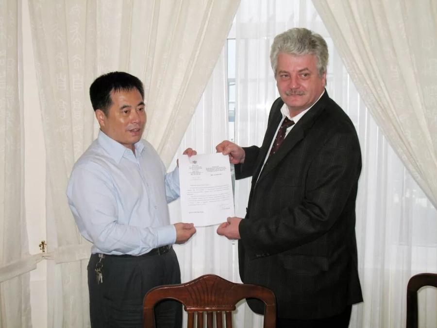 時任俄羅斯駐華大使謝•拉佐夫向當時的外教社社長莊智象呈送俄羅斯前總統賀信。