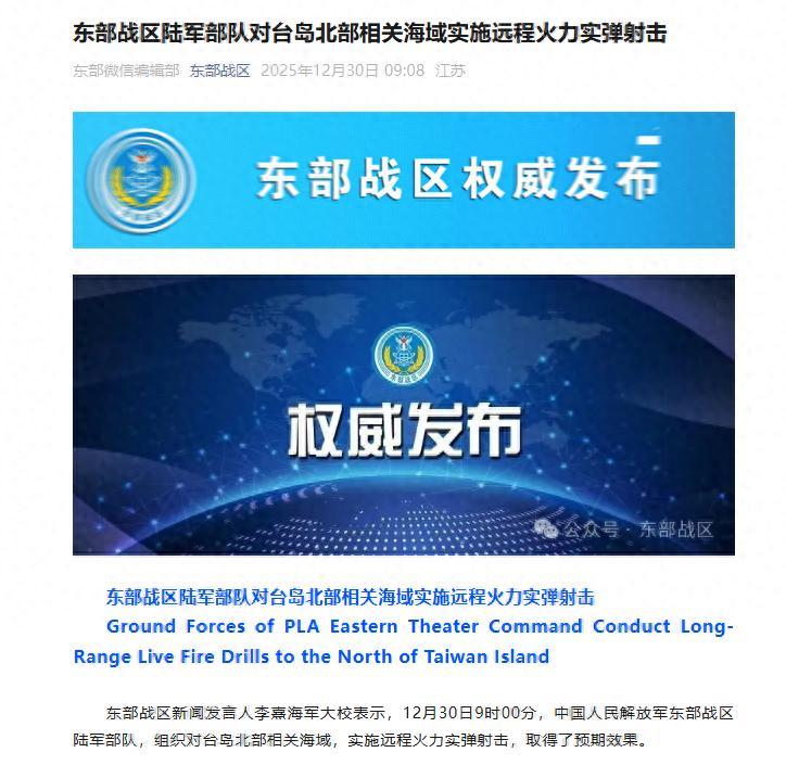 東部戰區新聞發言人李熹海軍大校表示,12月30日9時00分,中國人民解放軍東部戰區陸軍部隊,組織對臺島北部相關海域,實施遠程火力實彈射擊,取得了預期效果。