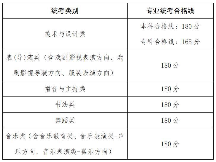 此外,表(導)演類(含戲劇影視表演方向、戲劇影視導演方向、服裝表演方向),播音與主持類,書法類,舞蹈類,音樂類(含音樂教育類、音樂表演類-聲樂方向、音樂表演類-器樂方向)專業統考合格線均爲180分。