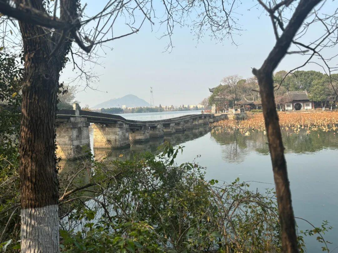 站在橋頭向四周望去,雖然冬天的紅蓼已經枯萎,但“湖山清麗說不盡”的意境,彷彿就在眼前。放翁《思故山》這首詩,其看橋的角度確實是從水面而來的,因爲你看“一彎畫橋出林薄,兩岸紅蓼連菰蒲”的“出”字、“連”字,就有搖着小舟而來的一種動態感、連續感,橋也活了,水生植物也活了,這正是AI寫不出來的具身感受。九百年時光悠悠,我們爲這樣與古人的邂逅而喜悅,更爲我們與詩人走過、看過同款的古橋而歆幸。恍惚間好像看到陸游“船頭一束書,船後一壺酒”的小船,從暮色中緩緩歸來了。