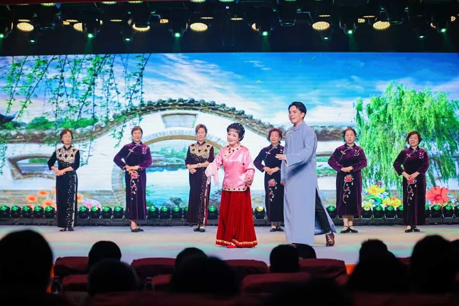 上海滬劇院專業演員丁葉波與陶春梅曲陽社區滬劇隊共演滬劇《大雷雨·人盼成雙月盼圓》。