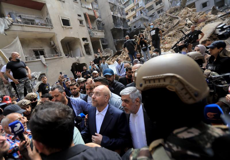10月12日,伊朗議長穆罕默德-巴蓋爾·加利巴夫(中左)到訪黎巴嫩貝魯特市中心最近遭以色列空襲的地點。新華社發