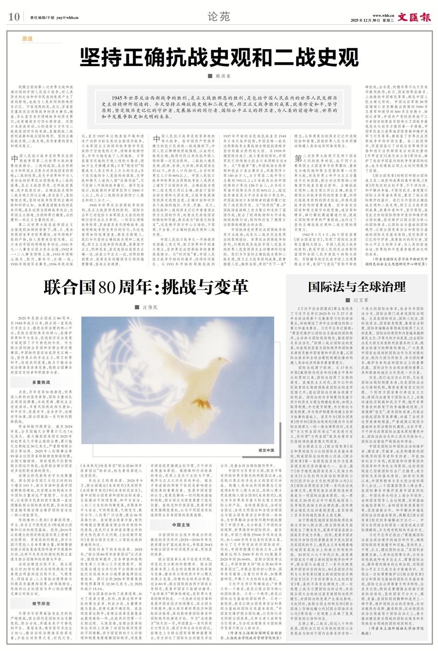 《聯合國憲章》的制定和聯合國的成立是二戰勝利成果的集中體現。《憲章》所規定的主權平等、不干涉內政、和平解決爭端、不使用武力、善意履行國際義務等基本原則,奠定了戰後國際秩序的基石。我們今天堅持正確抗戰史觀和二戰史觀,捍衛正義戰爭勝利成果,就要珍愛和平,堅守原則,在變亂交織的國際形勢中堅持和維護聯合國權威,堅定維護以聯合國爲核心的國際體系、以國際法爲基礎的國際秩序、以聯合國憲章宗旨和原則爲基礎的國際關係基本準則,堅定做歷史記憶的守護者、發展振興的同行者、國際公平正義的捍衛者,爲人類的前途命運、世界的和平發展爭取更加光明的未來。