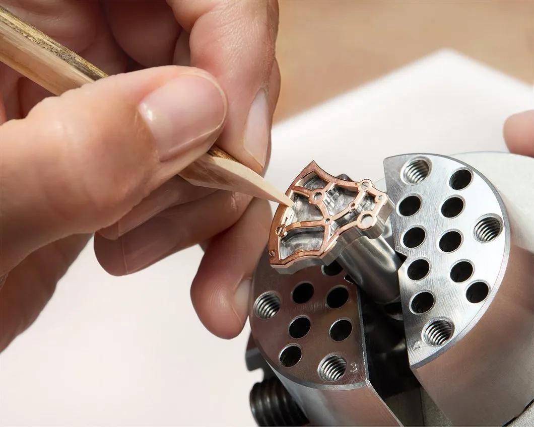 真正的奢華更體現在那些“看不見的細節”上。機芯的主夾板與26枚橋板均採用18K金打造,在材質柔軟的貴金屬上進行手工打磨考驗着製表師的極致技藝。