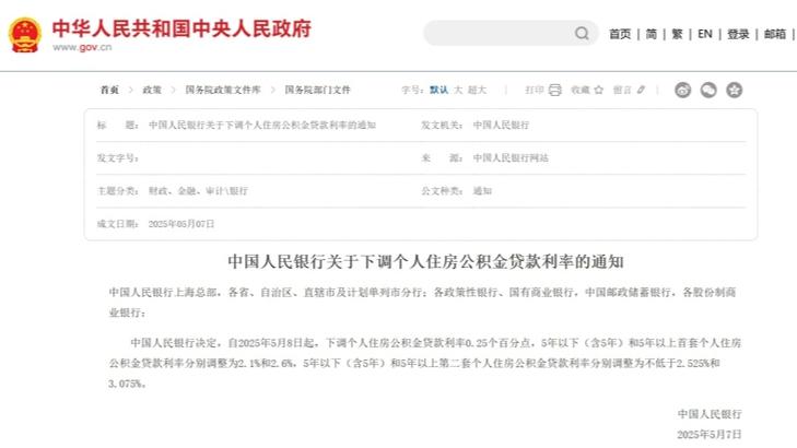 根據2025年5月7日發佈的《中國人民銀行關於下調個人住房公積金貸款利率的通知》,自2025年5月8日起,下調個人住房公積金貸款利率0.25個百分點,5年以下(含5年)和5年以上首套個人住房公積金貸款利率分別調整爲2.1%和2.6%,5年以下(含5年)和5年以上第二套個人住房公積金貸款利率分別調整爲不低於2.525%和3.075%。