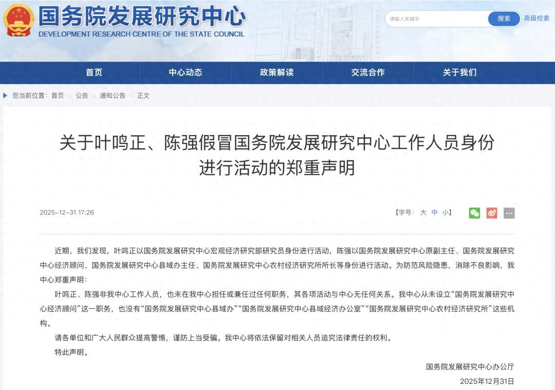 12月31日,國務院發展研究中心辦公廳發佈“關於葉鳴正、陳強假冒國務院發展研究中心工作人員身份進行活動的鄭重聲明”: