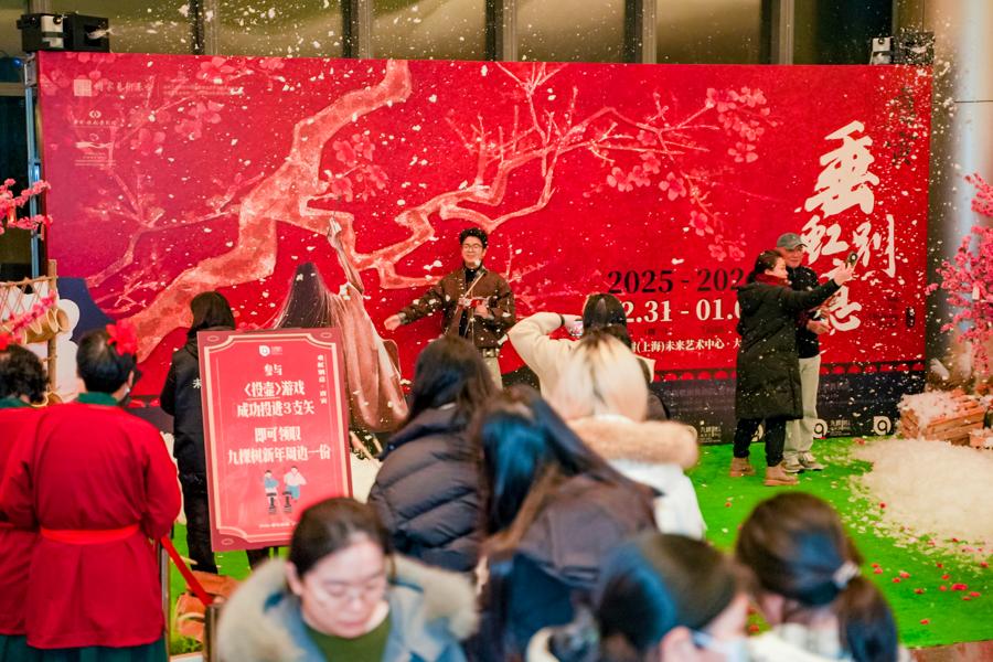 幕布尚未升起,藝術的漣漪已然盪開。《垂虹別意·唐寅》上演前,九棵樹藝術中心的大廳裏展開了一場流動的“桃花宴”,人造雪花從桃枝間靜靜飄落,非遺市集的暖光映照着江南冬夜。攤位前人頭攢動,不少觀衆駐足觀賞奉賢的土布染織技藝與琉璃燒製技藝。大家手捧熱氣氤氳的奉賢非遺“李記羊肉”,美食暖香爲冬日增添溫情。