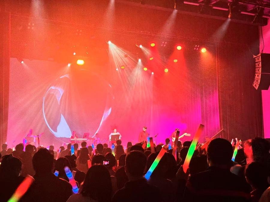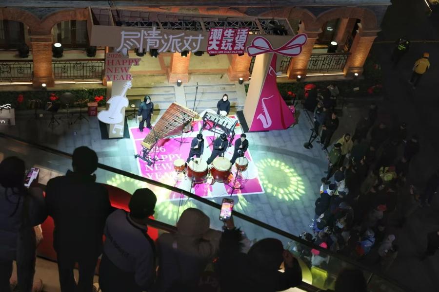 在濱港商業中心內文化場館“星臨天下”舉辦的跨年演唱會現場,人們揮舞熒光棒,跟着駐場樂隊唱起一首首時代金曲,共同迎接2026年的到來。“星臨天下”運營方負責人朱寅介紹,今天19點30分、22點30分這裏共舉辦兩場迎新演唱會,其中參與後一場跨年演唱會的票務預訂早早爆滿,兩場演唱會總計吸引1600多人到場。朱寅發現,包括演唱會、脫口秀等文娛產業帶動商場消費明顯:演出前,快餐、奶茶等店鋪生意火爆;散場後,燒烤店、酒吧等迎來客流。