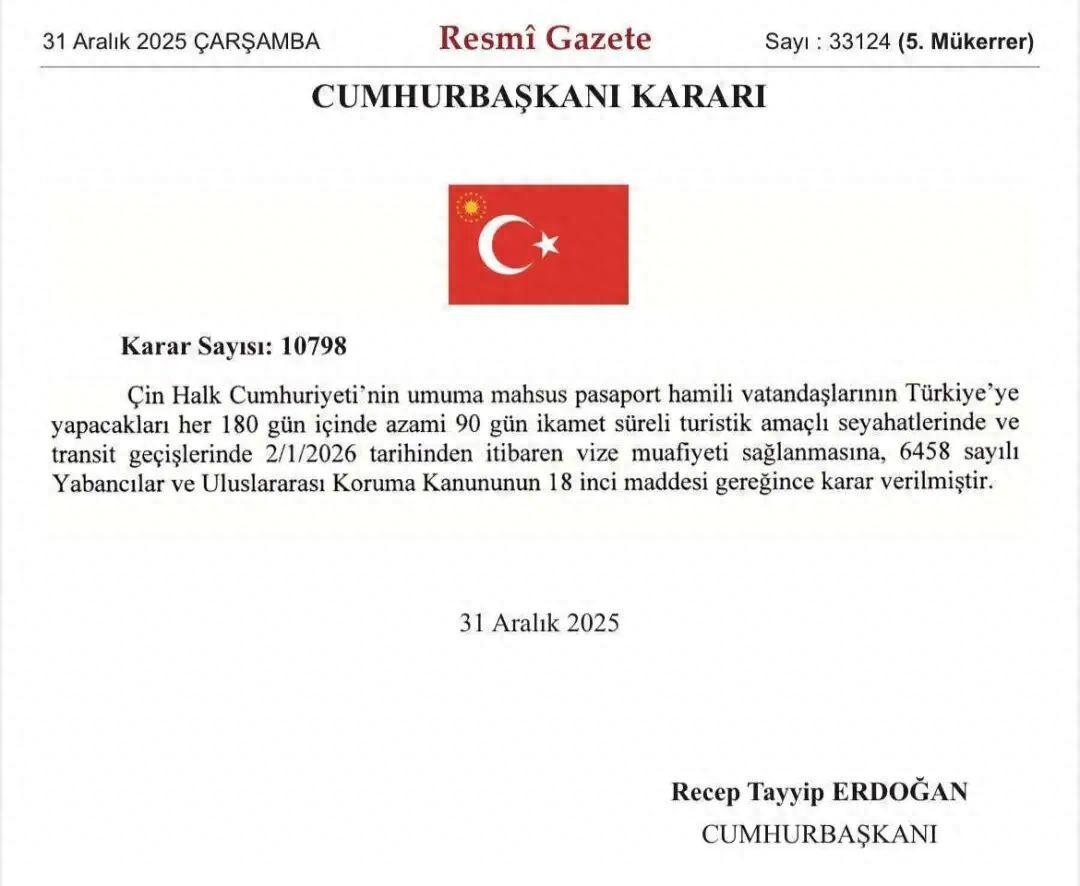 當地時間12月31日,土耳其《官方公報》發佈總統令,宣佈自2026年1月2日起,對持中國普通護照的公民實行免簽入境政策。