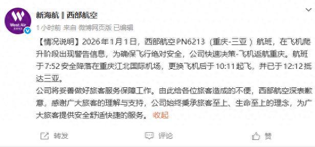 今天,西部航空發佈情況說明:2026年1月1日,西部航空PN6213(重慶-三亞 )航班,在飛機爬升階段出現警告信息,爲保障旅客生命財產萬無一失,公司快速決策-飛機返航重慶。航班於7:52安全降落在重慶江北國際機場,更換飛機後於10:11起飛,並已於12:12抵達三亞。