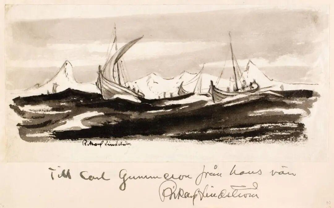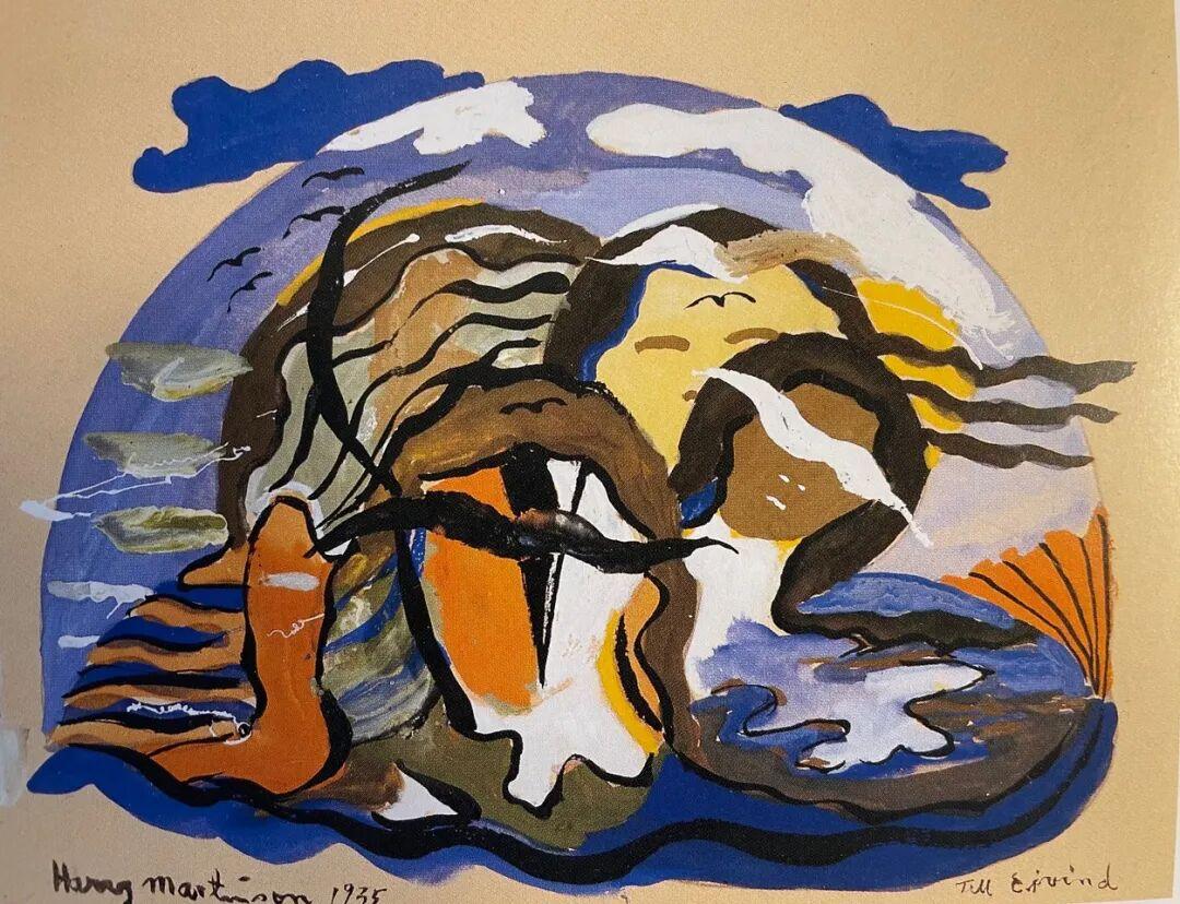 哈瑞·馬丁松在1929年給出版商寫過這樣的自我介紹:“船長的兒子……14歲到海上,在不同國家的旗幟下,作爲打雜男孩、司爐工和廚師,在18條船上航海多年。”航海經歷給了馬丁松特別的眼睛和圖景(下圖爲馬丁松的畫作),比如這幾句詩:“在海上人覺得春天或夏天只是一陣掠過的風/漂流的佛羅里達海藻有時在夏天開花/而在某個春夜一隻琵鷺朝着荷蘭飛去。”又比如,他感嘆:“大海浩大,永恆而浩大,/航線只是些線條/從雲杉的北方森林/直拉到南方海洋的棕櫚和笠松。”