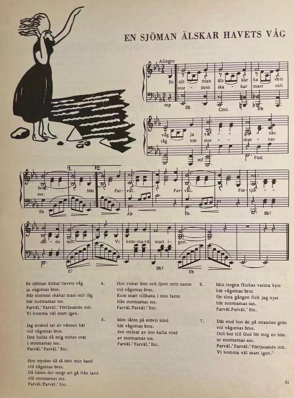 因爲我看見一支歌,在海上揚帆。它的傳播證明了其藝術美和生命力。被水手和漁民、男人和女人、兒童和成人、北歐人和中國人歌唱,無論獨唱還是合唱,許許多多的演繹都保留了歌詞積蓄的、那最初的情境純度。