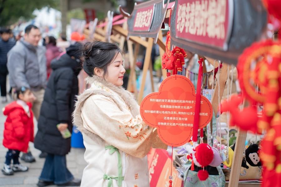 “賢城春市”沉浸式古風新年遊園會,讓市民遊客搖身變成“時空旅人”。大家身着精緻古裝,穿梭在古色古香的市集裏,忙着參與投壺、飛花令、詩詞接龍等趣味雅戲,在手作區靜下心來體驗非遺技藝的精妙。遊園會以“收集福、祿、壽、喜、財五禧之證”的任務爲線索,將美食、文創、非遺展演等內容巧妙串聯,不少親子家庭結伴而行,在闖關打卡中收穫滿滿樂趣。“帶着孩子來這裏,既能玩遊戲,又能近距離接觸傳統文化,這個元旦過得太有意義了。”市民李女士的話,道出了許多遊客的心聲。
