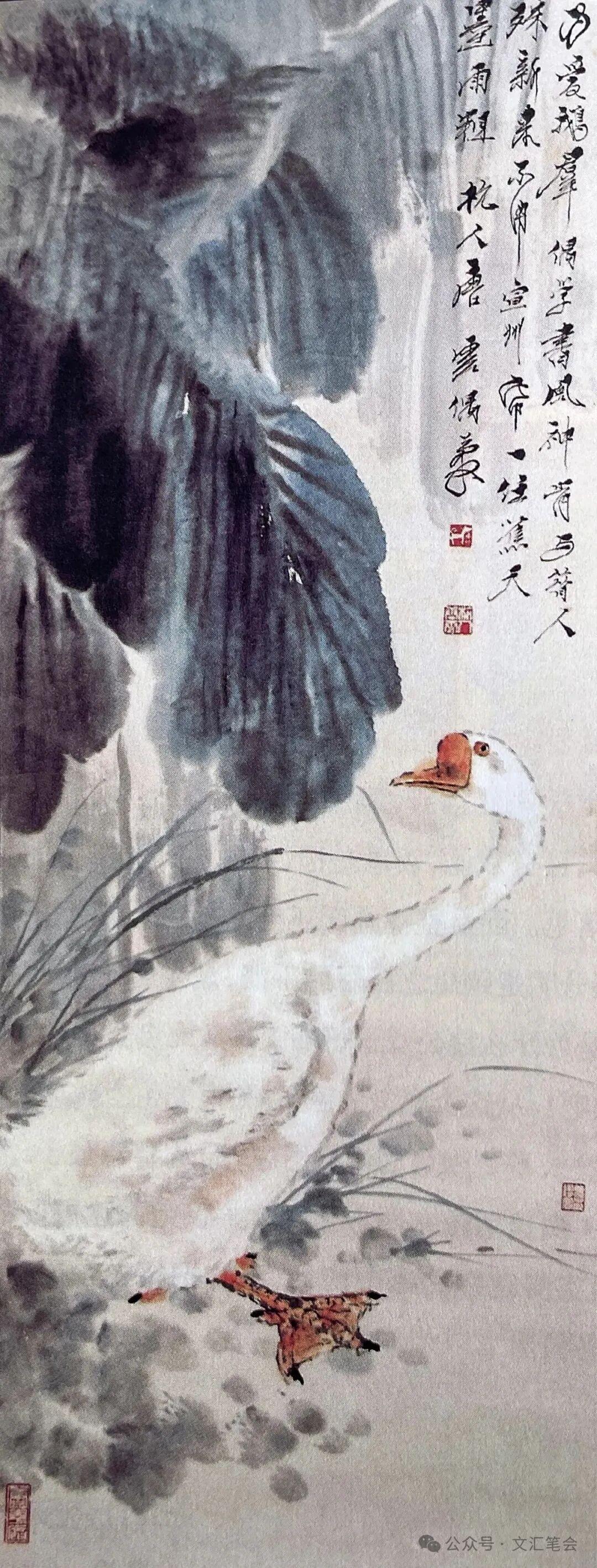 若干年後,終於有緣獲得唐先生的一幅《綠天白鵝圖》(上圖)。唐先生在此畫中以大塊墨色花青繪出芭蕉,畫面效果豐而糯厚,重而彌清,給人以酣暢淋漓之感。白鵝則是整幅作品“畫眼”,畫家用頓挫之筆畫出白鵝外形,大塊留白,略加點染,配以特別響亮的鵝紅,讓人過目不忘,超塵絕俗,體現出文人寫意畫的超邁格調。唐先生的畫,自有一種韻律感,是對這世界的溫柔和解。他懂得所有法度,然後笑着,用一壺熱酒,將那些法度化開,化成一片天真爛漫的生機。他的藝術裏,有最深切的人情味。這味道,比任何玄妙的哲理,都更貼近生命的本真。“是真名士自風流”,《菜根譚》裏的這句話,用在唐雲先生身上再也合適不過了。