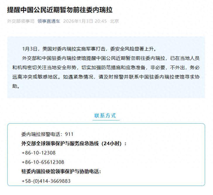1月3日,美國對委內瑞拉實施軍事打擊,委安全風險顯著上升。