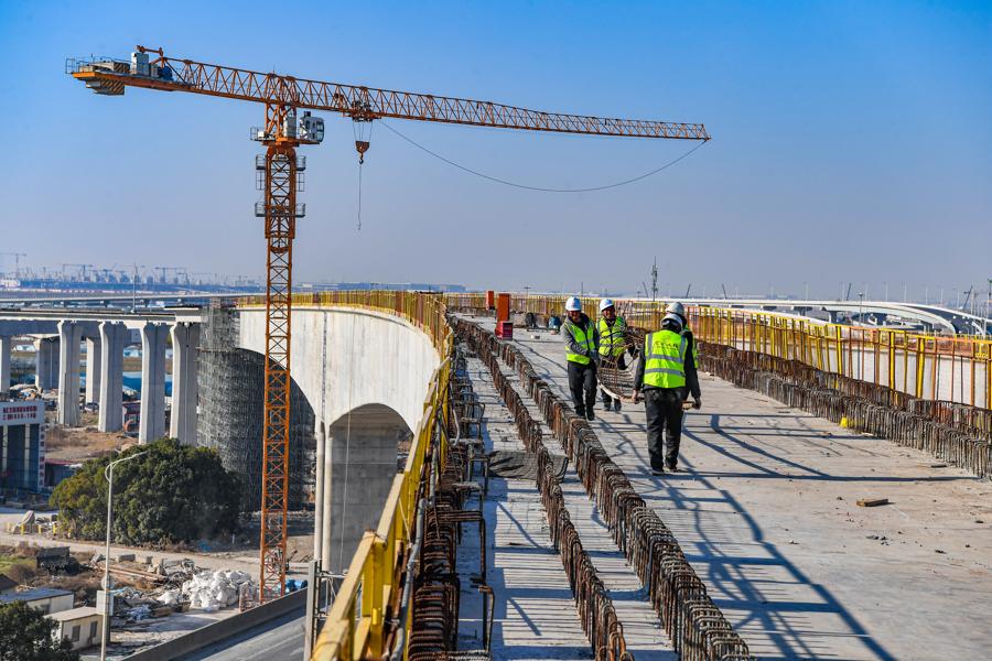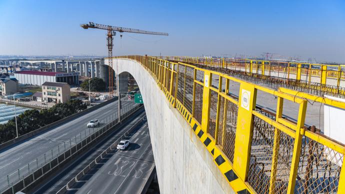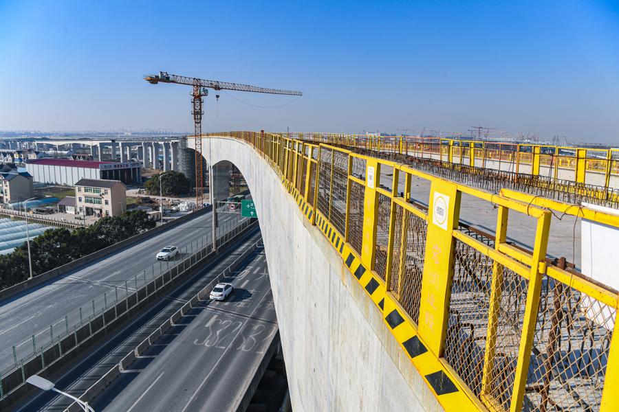 宏潤建設集團有限公司南匯支線(兩港市域鐵路)工程NHSG-10標生產經理何舟向記者介紹:“合龍之後,施工團隊這幾天正在進行收尾工作,並抓緊時間完成跨兩港公路主線邊跨現澆箱梁支模架搭設工作。”